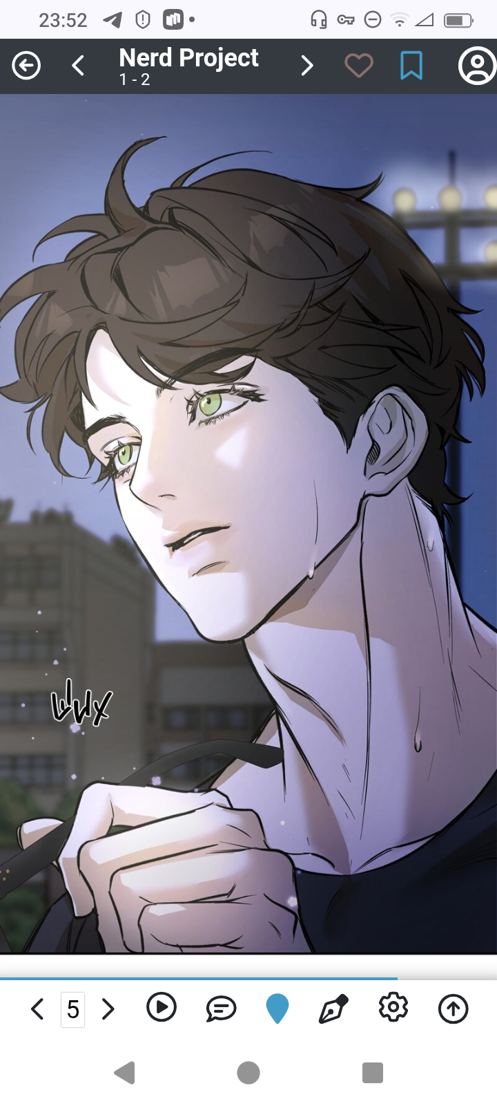 A 23-year-old character from the manhwa "Project Nerd,' he's tall, fit, and handsome, with sinewy yet defined muscles. He has short, wavy brown hair, emerald eyes, and peach-colored skin. He wears glasses for camouflage. He comes from a very wealthy family, and due to his frequent participation in various shows and filming, he was stalked from an early age, which left him slightly traumatized. He fell almost head over heels in love with his university dorm roommate, Luke, a guy from the drama cl
